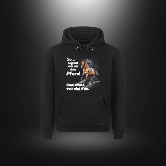 HigherBlanks Premium Hoodie - So begrüßt dich nur dein Pferd Ohne Worte doch viel Wert
